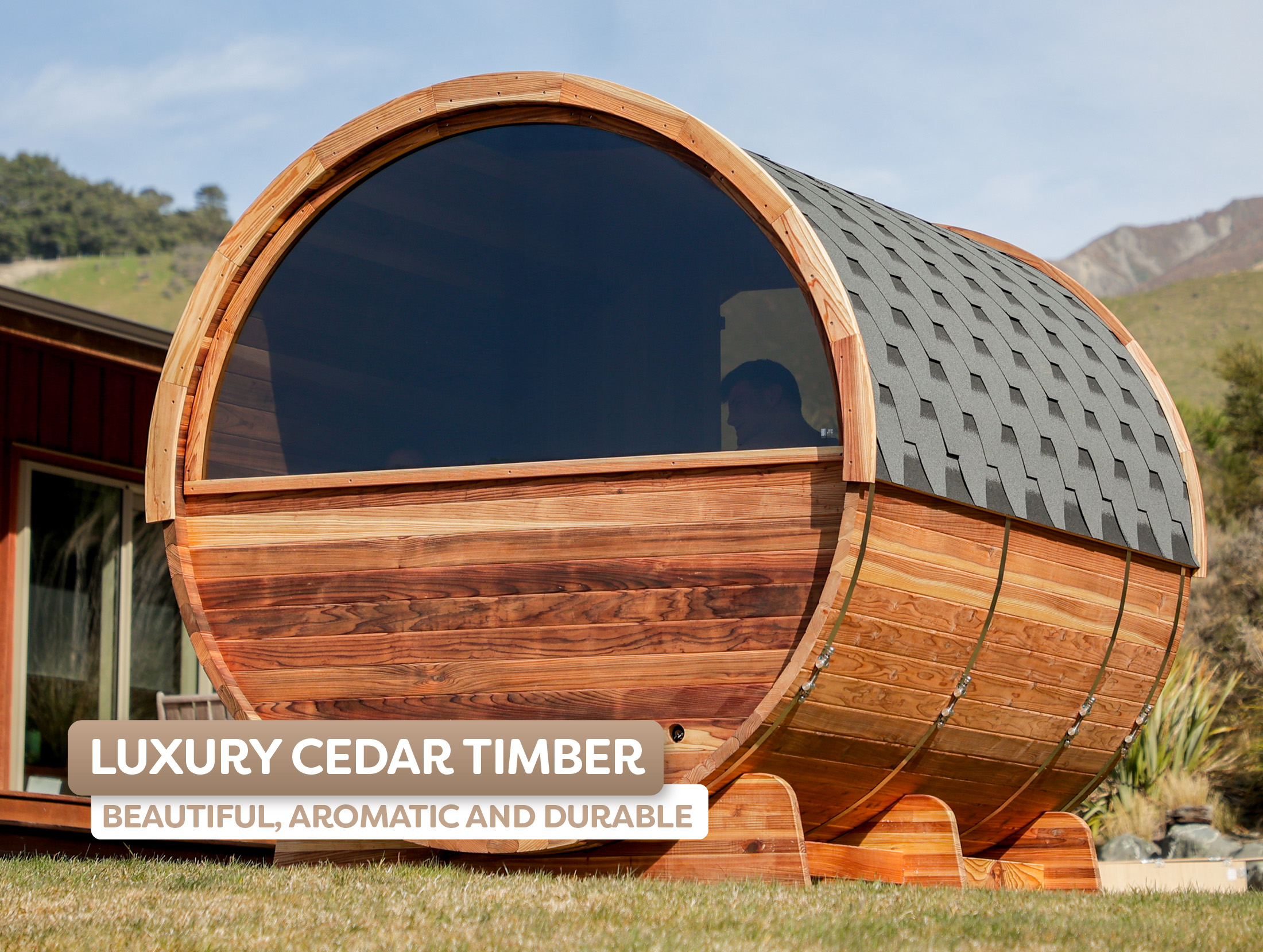 Enjoy panoramic views, soothing heat, and cedar comfort with the Vista Barrel Sauna.