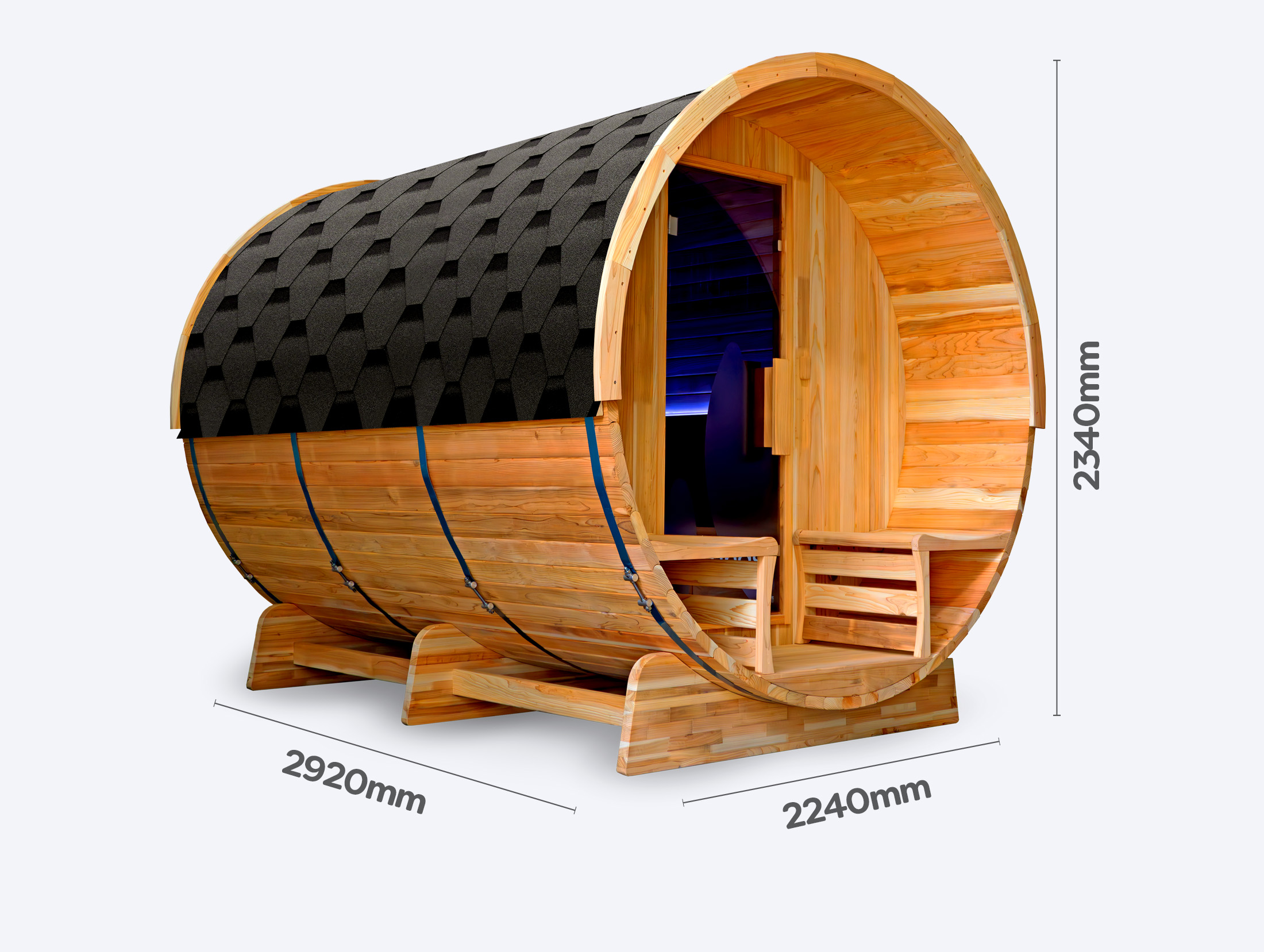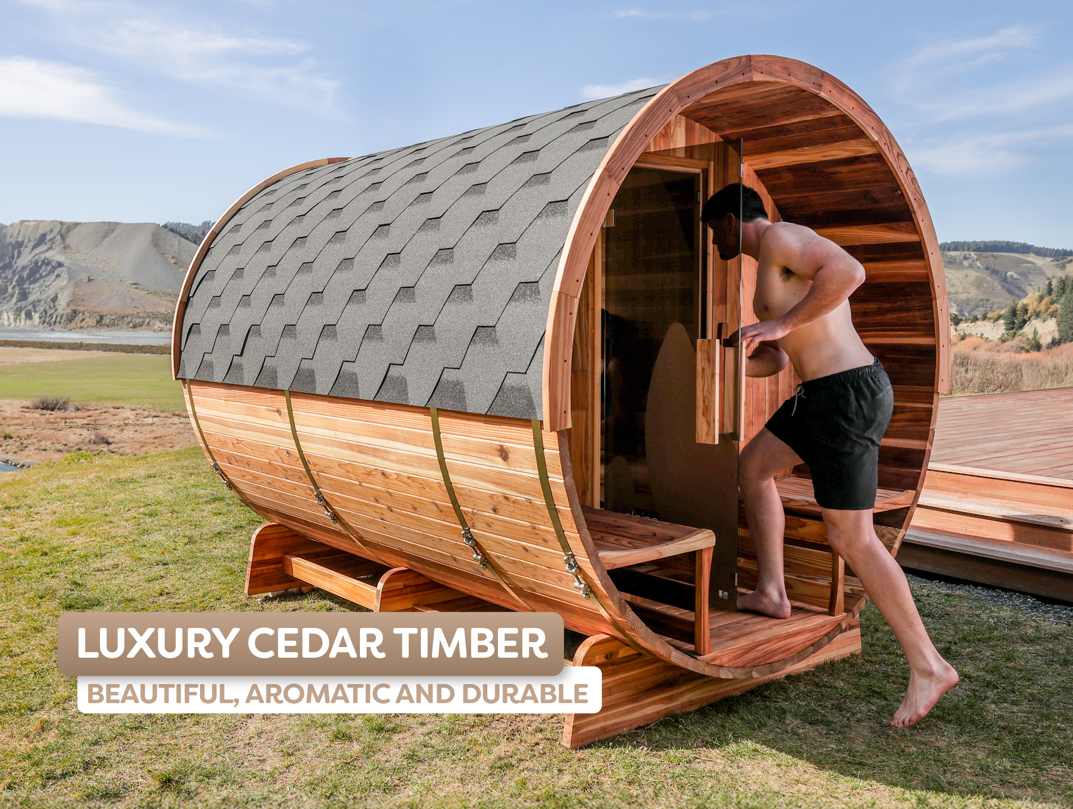 The Vista XL Barrel Sauna combines handcrafted elegance with generous space for up to 8 adults. Made from sustainable FSC® Certified Cedar with durable Bitumen roofing, it’s built for Australia’s climate. A powerful 9kW Harvia™ Heater and Olivine Stones deliver authentic Finnish heat, while a panoramic glass window frames breathtaking views. With easy-to-use controls and a 4-litre bucket and ladle, every session is pure relaxation.