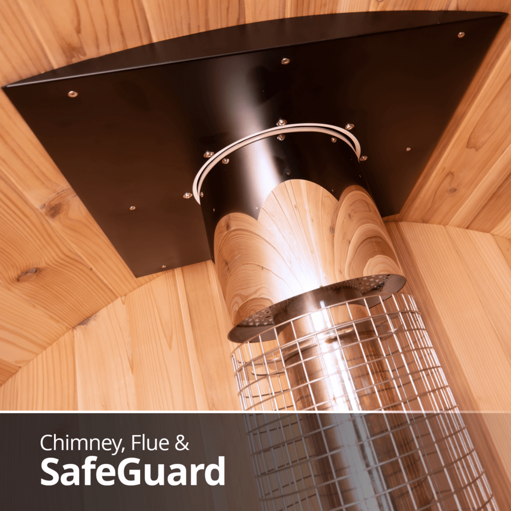 We’ve taken every step possible to minimise the risk of burn from the flue which carries smoke outside your Wood Fired Sauna. The flue is constructed with dense steel, allowing for a double-wall design that effectively traps heat working alongside a robust steel SafeGuard providing a protective no-touch barrier.