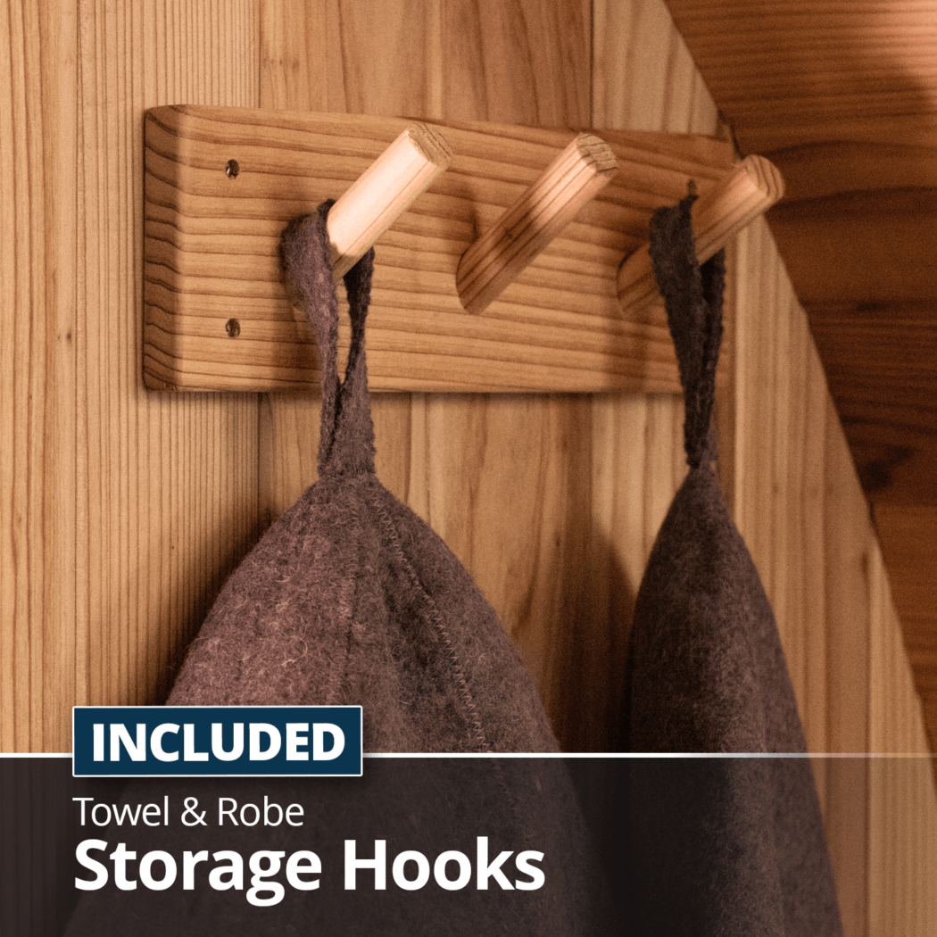 Keep your robe on hand and easy to access with hooks on the outside of the sauna.